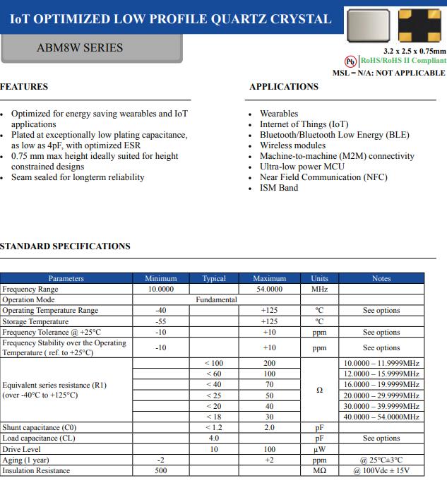 更多>>艾博康的高質量石英晶體ABM8W-38.4000MHZ-4-B2U-T3,比較適合用于超低功耗MCU
