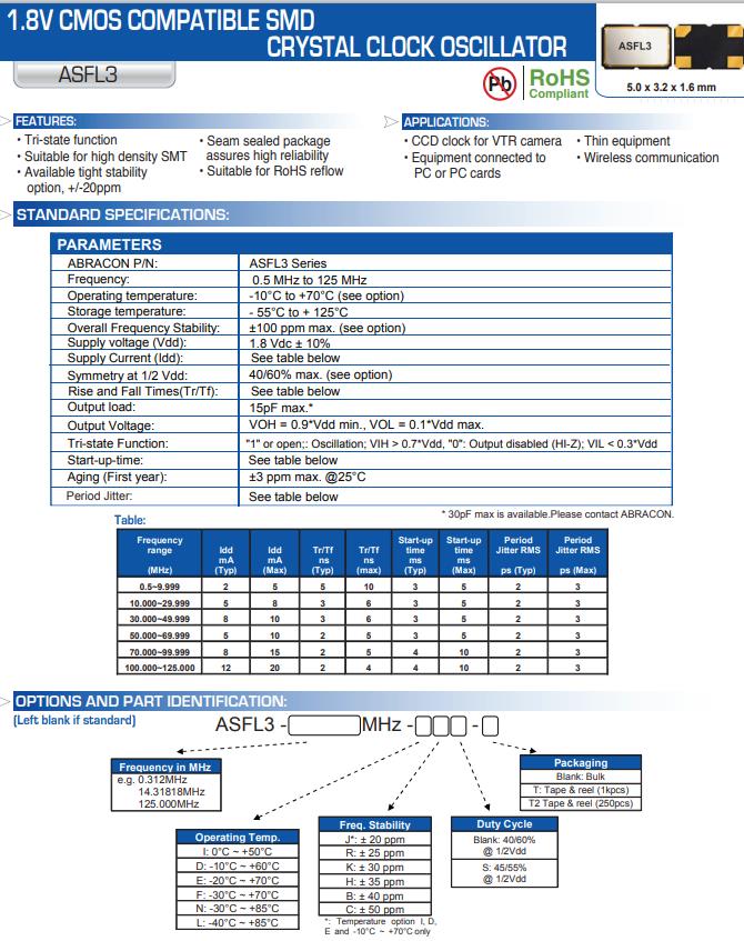 編碼ASFL3-24.576MHZ-EK-T,型號ASFL3,XO時鐘振蕩器,石英晶體振蕩器,尺寸為5032mm,頻率24.576MHz,特征:三態(tài)函數(shù),適合高密度SMT,可用的緊密穩(wěn)定性,選項,+/-20ppm,接縫密封包裝,確保高可靠性,適合RoHS回流.應用: VTR攝像機的CCD時鐘,設備連接到PC或PC卡,薄型設備,無線通信.