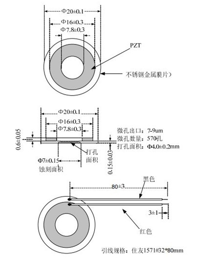 微孔霧化片的工作原理.由于微孔霧化片的頻率和工作電壓都是比較小的,所以它不用放在水里工作,它是噴霧工作是通過中間的微孔噴出來,先把海綿吸棒固定在容器里,在通過設計把霧化片中間孔徑固定在海綿吸棒上.在通過電流工作(因為微孔霧化片的頻率和電壓功率低,所以不用擔心會出現燒壞霧化片的問題)把水通過海綿吸棒吸上來.在從中間孔徑噴灑出去.改善房間空氣質量,減少干燥保護身心健康.常用的規格有16mm、18mm、20mm等,常用頻率110khz-160khz之間都可以產生.