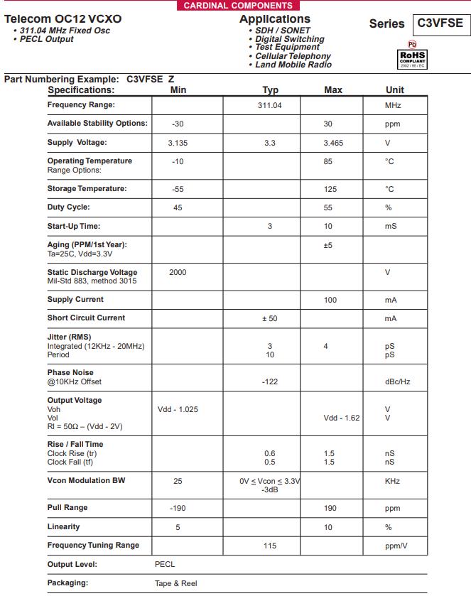 | C3VFSE7 | Cardinal | OSC VCXO 311.04MHZ PECL SMD | VCXO | 311.04MHz | PECL | ±30ppm | -10°C ~ 85°C |