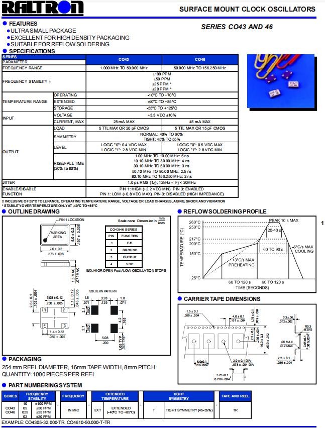 | CO43 系列 33.333 MHz 7 x 5 mm 3.3 V ±50 ppm 表面貼裝 時鐘振蕩器 | ||||||