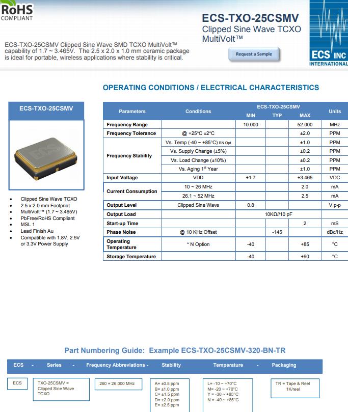 ECS-TXO-25CSMV MultiVolt™ 削波正弦波緊密??穩定性TCXO溫補晶振允許客戶在多種設計中使用相同的設備。
