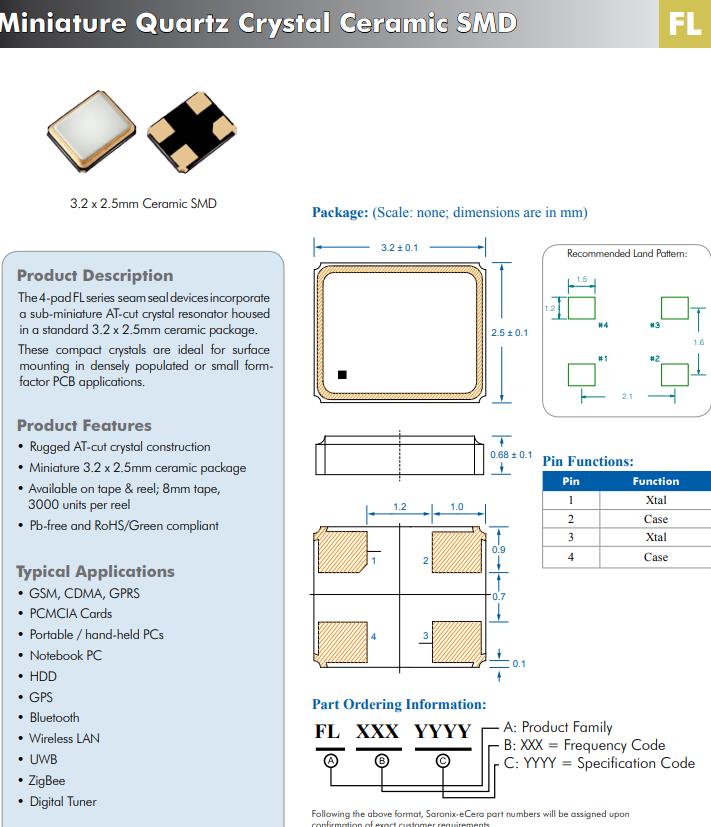 4墊FL系列石英晶體諧振器由接縫密封裝置一個(gè)微型at切割晶體諧振腔標(biāo)準(zhǔn)的3.2 x 2.5mm陶瓷包裝。這些致密的晶體是理想的表面安裝在人口密集或小尺寸PCB應(yīng)用。