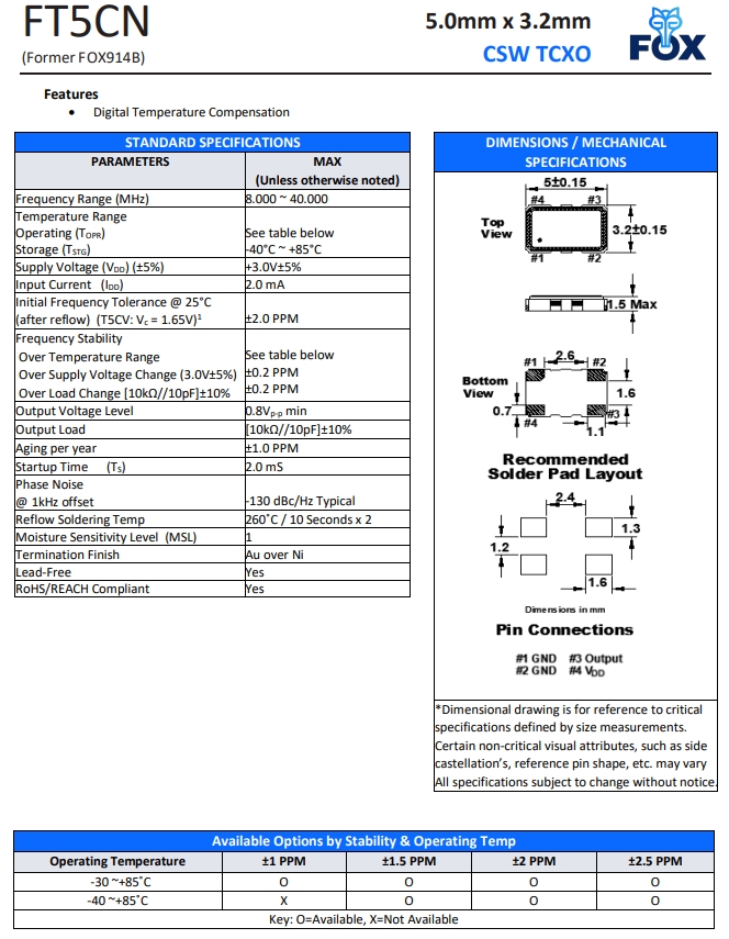 | FOX914B-26.000 | FOX晶振 | FOX914 | TCXO | 26MHz | 3V |