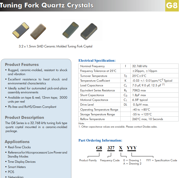 G8系列是32.768 kHz音叉型石英晶體安裝在陶瓷模塑包中。