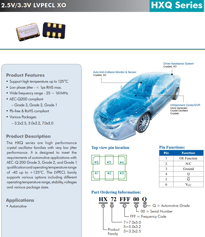 HXQ-LVDS系列 7050 20~50 7.0 x 5.0 LVDS 3.32.5 6 2.5V/3.3V、7.0x5.0mm、汽車級、高溫LVDS晶體振蕩器