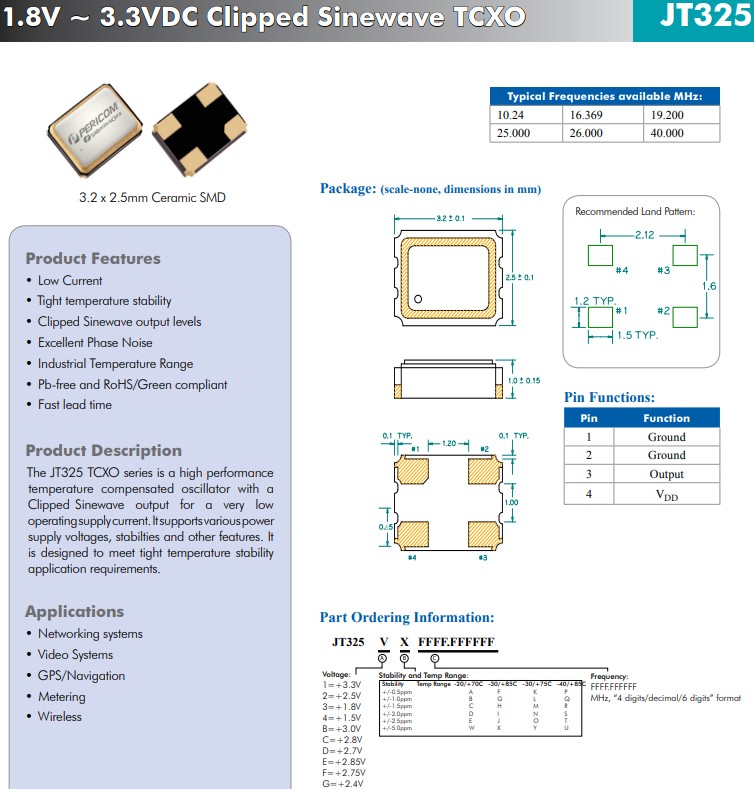 JT325系列是一款高性能溫度補(bǔ)償振蕩器(TCXO),溫補(bǔ)晶振,具有削波正弦波輸出,可實(shí)現(xiàn)非常低的工作電源電流。它支持各種電源電壓、穩(wěn)定性和其他功能。它旨在滿足嚴(yán)格的溫度穩(wěn)定性應(yīng)用要求。
