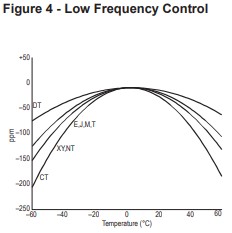圖4顯示了幾個(gè)低頻截點(diǎn)的頻率溫度曲線。J切割在10kHz以下使用,而XY切割可以 從3千赫到85千赫使用。NT-cut可用于10kHz 范圍。DT-cut適用于100kHz至約800kHz,CTcut適用于300kHz至900kHz。