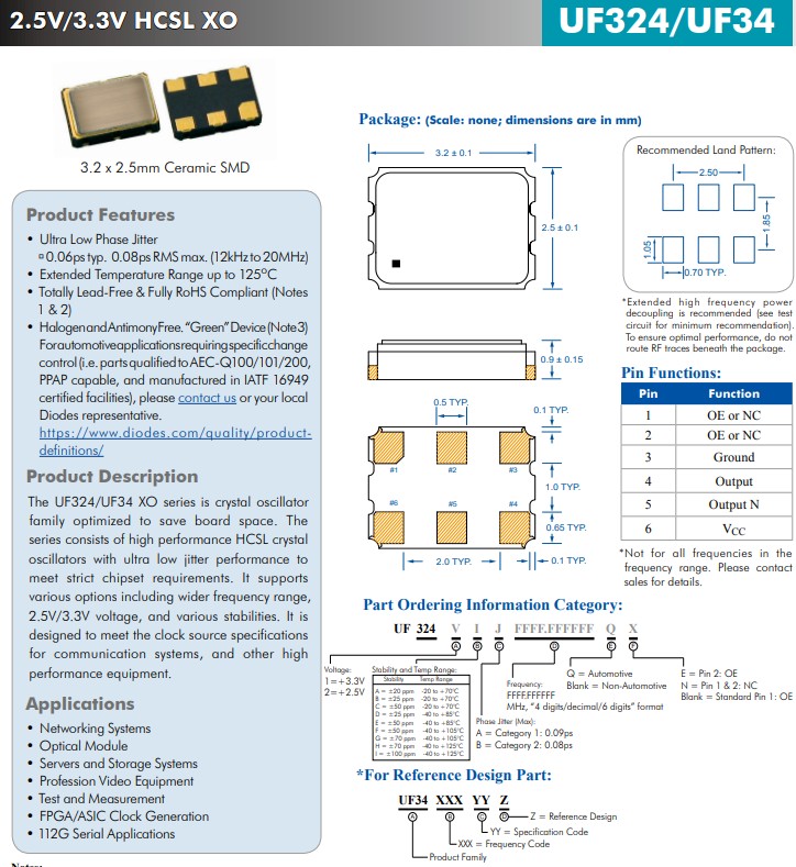 UFQ324/34 20~100 3.2 x 2.5 x 0.9 HCSL 3.32.5 6 2.5V/3.3V、3.2x2.5mm、超低抖動HCLS晶體振蕩器