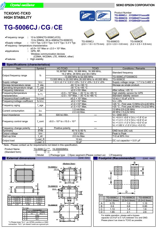 | X1G004131004916 | TG-5006CJ | 26.000000 MHz | 2.00 x 1.60 x 0.73 mm | 1.700 to 1.900 V | +/-2.0 ppm | -30 to +85 °C | +/-2.00 ppm |