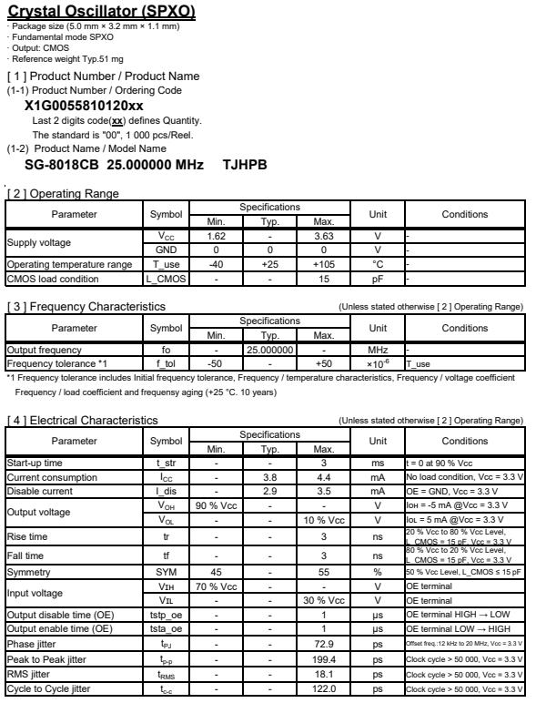 | X1G005581012000 | SG-8018CB | 25.000000 MHz | 5.00 x 3.20 x 1.30 mm | CMOS | 1.620 to 3.630 V | -40 to 105 °C | +/-50 ppm |