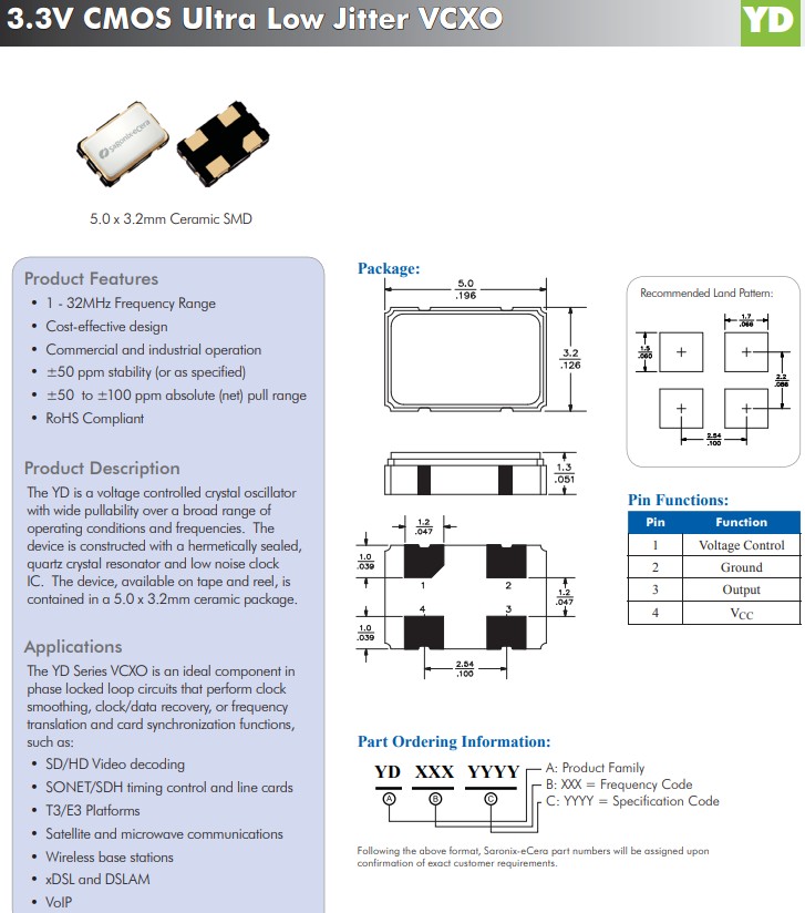 亞陶晶振YD系列超低抖動壓控晶體振蕩器,YNETHE125,YD16.0005032,壓控晶體振蕩器,ECERA低抖動晶振