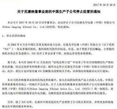 10月30號(hào),尼康召開(kāi)董事會(huì),決定停止子公司無(wú)錫市尼康光學(xué)儀器(中國(guó))的經(jīng)營(yíng)。 尼康光學(xué)儀器2002年6月在江蘇無(wú)錫成立,一直從事數(shù)碼相機(jī)、數(shù)碼相機(jī)用組件的制造。關(guān)于停止經(jīng)營(yíng)的理由,尼康在停止經(jīng)營(yíng)的通知中這樣表示:由于智能手機(jī)的崛起,小型數(shù)碼相機(jī)市場(chǎng)正在急速縮小,NIC的開(kāi)工率也顯著下降,持續(xù)經(jīng)營(yíng)變得非常困難。除了尼康光學(xué)儀器有限公司之外,尼康在中國(guó)其他的子公司以及生產(chǎn)線都將正常運(yùn)行尼康關(guān)閉這家公司后,將集中精力生產(chǎn)單反相機(jī)等高附加值產(chǎn)品。