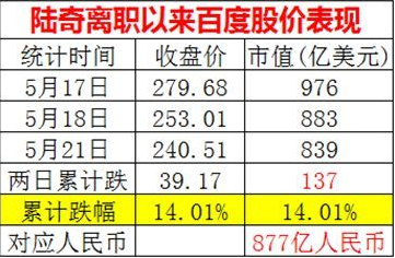 陸奇,百度集團總裁兼首席運營官,畢業于復旦大學,獲計算機科學學士、碩士學位。曾就讀于卡耐基梅隆大學,獲計算機科學博士學位。他除了在學術界發表過一系列高質量的研究論文,還持有40多項美國專利。 短短兩個交易日,百度的股價從279.68元,下跌到了240.51元,跌幅超過了14%。