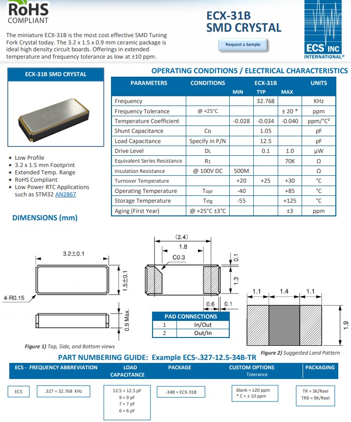 | ECS-.327-9-34B-TR | ECS Crystal | ECX-31B | 32.768kHz | -40°C ~ 85°C |