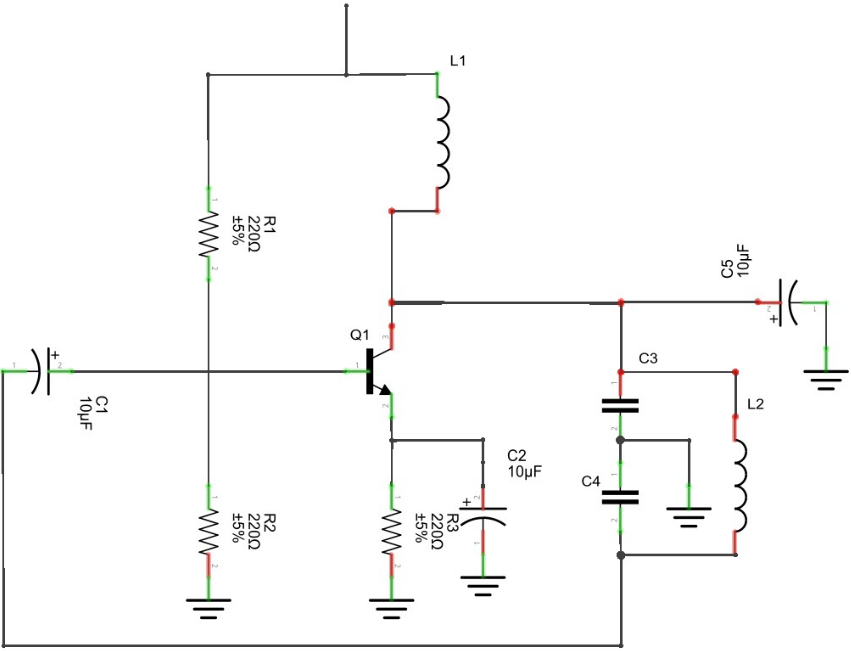 以下電路圖顯示了常見的Colpitts基本電路.電感器L和電容器C1和C2都與并聯(lián)諧振回路電路串聯(lián),它給出振蕩器的頻率.C2端子上的電壓施加到晶體管的基極-發(fā)射極結(jié),以產(chǎn)生反饋振蕩.
