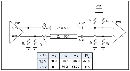 大多數SiTime差分振蕩器沒有CML輸出選項,但它們可以使用LVPECL驅動器驅動CML接收器.在這種情況下,端接原理圖必須確保接收器輸入端的單端電壓擺幅為400毫伏,VDD共模電壓為200毫伏[2】.圖4顯示了驅動帶LVPECL輸出的CML接收器的推薦端接原理圖.由于LVPECL和CML共模電壓之間的巨大差異,DC電流隔離需要耦合電容.電阻RB用于LVPECL差分晶體驅動器的適當偏置.接收器端的戴維寧等效端接設置適當的偏置電壓,并與RB電阻一起確保適當的信號擺幅.