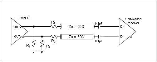 圖6:LVPECL驅動器與帶內部端接和偏置的自偏置差分接收器的連接.