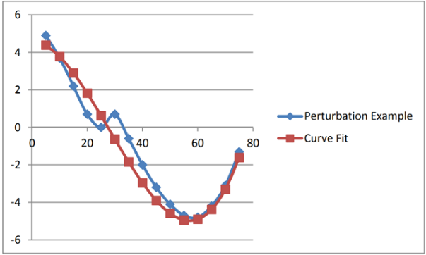 擾動 該圖中的測量數(shù)據(jù)標(biāo)記為藍(lán)色.紅線是嘗試將三階多項(xiàng)式擬合到數(shù)據(jù).對于沒有擾動的晶體,多項(xiàng)式和測量數(shù)據(jù)之間的匹配應(yīng)該優(yōu)于所有點(diǎn)的0.5ppm.三階多項(xiàng)式通常足以用于AT切割晶體.