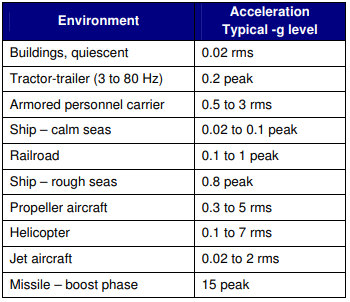 所有電子產(chǎn)品在其壽命期間都會受到?jīng)_擊和振動.力的范圍從口袋或背包中攜帶的移動消費品所經(jīng)歷的運動到工業(yè)設(shè)備或航空航天應(yīng)用的高振動水平.甚至建筑物中的固定產(chǎn)品也可能會受到附近風(fēng)扇或其他設(shè)備的振動.因此,重要的是要考慮石英晶體振蕩器在沖擊和振動情況下的表現(xiàn).表1顯示了各種環(huán)境下的典型加速度水平.