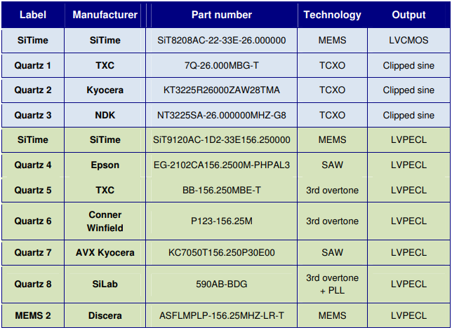 表2測試中的振蕩器設(shè)備;單端部分(藍色陰影部分)工作在26兆赫,差分部分(綠色陰影部分)工作在156.25兆赫