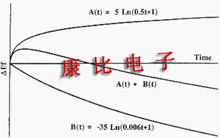 老齡化可能是積極的還是消極的[17].偶爾會(huì)觀察到老化方向的逆轉(zhuǎn).在恒定溫度下,老化通常具有與時(shí)間近似的對(duì)數(shù)依賴性.典型的(計(jì)算機(jī)模擬的)老化行為如圖16所示,其中A(t)是對(duì)數(shù)函數(shù),B(t)是相同的函數(shù)但具有不同的系數(shù).顯示反轉(zhuǎn)的曲線是其他兩條曲線的總和.逆轉(zhuǎn)表明存在至少兩種老化機(jī)制.振蕩器的老化率在首次打開時(shí)最高.當(dāng)晶體單元的溫度改變時(shí)(例如,當(dāng)OCXO關(guān)閉并且稍后打開時(shí)),開始新的老化循環(huán).(有關(guān)溫度循環(huán)影響的其他討論,請(qǐng)參閱下面有關(guān)滯后和回掃的部分.)