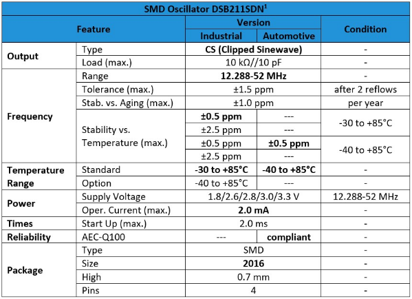 1所選參數,具有所有特性的完整表及其有效性的相應條件可在石英晶體振蕩器DSB211SDN的數據表中找到.表中給出的規格適用于標準"工業"或"汽車"振蕩器.