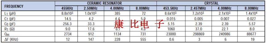 等效電路常數:圖1.2顯示了陶瓷諧振器的符號.端子間的阻抗和相位特性如圖1.5所示.該圖說明諧振器在提供最小阻抗的頻率fr(諧振頻率)和提供最大阻抗的頻率fa(反諧振頻率)之間的頻率范圍內變為電感性的.它在其他頻率范圍內變得具有電容性.這意味著雙端諧振器的機械振動可以用等效電路代替,該等電路由串聯和并聯諧振電路的組合構成,其中包括電感器L,電容器C和電阻器R.在諧振頻率附近,等效電路可以表示如圖1.4所示.fr和fa頻率由壓電陶瓷材料及其物理參數決定.等效的循環常數可以從以下公式確定: 考慮到fr<f<fa的有限頻率范圍,阻抗給定為Z=Re+jwLe(Le<=0),如圖1.5所示.陶瓷諧振器應作為具有損耗Re()的電感器Le(H)操作.圖1.1表示陶瓷諧振器和石英晶體諧振器之間等效電路常數的比較,注意,電容和Qm存在很大差異,這導致實際操作時振蕩條件的差異.附錄中的表格顯示了每種陶瓷激光器的等效電路常數的標準值.除了期望的振蕩模式之外,存在用于其他振蕩模式的高次諧波.存在這些其他振蕩模式是因為陶瓷諧振器使用機械??共振.圖1.6顯示了這些特征.