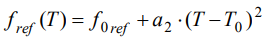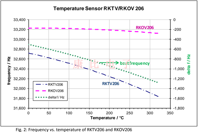 溫度傳感器晶體RKTV206顯示諧振頻率對溫度T的單調(diào)響應,如圖2所示(藍色點劃線).