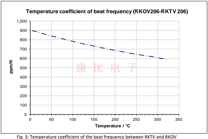 如果參考晶體RKOV206與傳感器晶體RKOV206結合使用,兩個晶體成對使用,頻率差約為550Hz@25.如果兩個晶振處于相同的溫度下,RKOV206和RKOV206之間產(chǎn)生的頻率差(拍頻)如圖2所示(綠色虛線).拍頻的溫度系數(shù)如圖3所示.它比僅RKTV頻率的溫度系數(shù)(25°C)高15倍. 實際應用