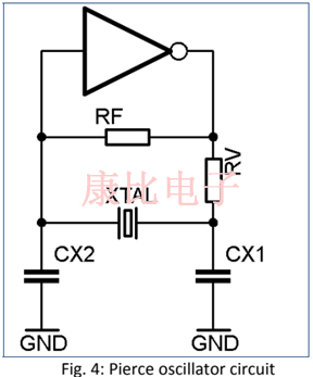 串聯(lián)電阻RV被要求保護晶體免受過量晶體電流的過載,這可能導致晶體的永久損壞.它的價值大約在47kΩ到470kΩ.之間由于該電阻降低了環(huán)路增益,因此必須小心選擇.兩個電容器CX1和CX2在4.7pF至10pF的范圍內(nèi).晶體端子和石英晶體振蕩器電路之間的線必須短(幾厘米),并且對地和兩條線之間的電容低.