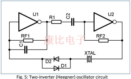 該電路基本上由兩個串聯(lián)的邏輯反相器門組成,晶體插入第二反相器的輸出和第一反相器的輸入之間.這個電路允許用比皮爾斯振蕩器稍長的引線連接晶體.