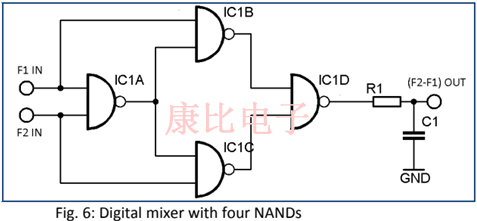 如圖6所示,混合可以通過使用四路NANDIC的數(shù)字混頻器來實現(xiàn). 示意圖中所示的R1-C1低通僅是象征性的,可能無法提供足夠的過濾.或者,混合可以通過微控制器中的軟件直接執(zhí)行.