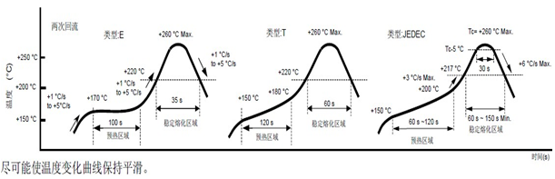 加熱包裝材料至+150°C以上會破壞產品特性或損害產品.如需在+150°C以上焊接晶體產品,建議使用SMD晶振產品.在下列回流條件下,對晶體產品甚至SMD產品使用更高溫度,會破壞產品特性.建議使用下列配置情況的回流條件.安裝這些產品之前,應檢查焊接溫度和時間.同時,在安裝條件更改的情況下,請再次進行檢查.如果需要焊接的晶體產品在下列配置條件下進行焊接,請聯系我們以獲取耐熱的相關信息.