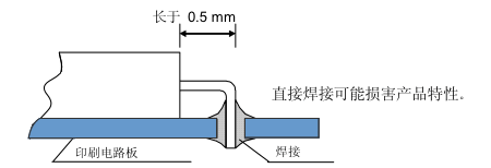 產(chǎn)品的玻璃部分直接彎曲引腳或用力拉伸引腳會(huì)導(dǎo)致在引腳根部發(fā)生密封玻璃分裂(開裂),也可能導(dǎo)致氣密性和產(chǎn)品特性受到破壞.當(dāng)晶體產(chǎn)品的引腳需彎曲成下圖所示形狀時(shí),應(yīng)在這種場景下留出0.5mm的引腳并將其托住,以免發(fā)生分裂.當(dāng)該引腳需修復(fù)時(shí),請勿拉伸,托住彎曲部分進(jìn)行修正.在該密封部分上施加一定壓力,會(huì)導(dǎo)致氣密性受到損壞.所以在此處請不要施加壓力.另外,為避負(fù)機(jī)器共振造成引腳疲勞切斷,建議用粘著劑將產(chǎn)品固在定電路板上.