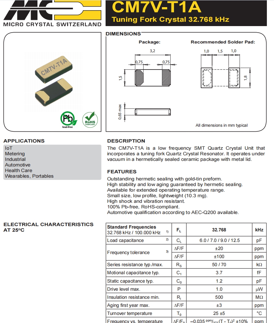 CM7V-T1A是一款低頻SMT石英晶體單元包含一個音叉石英晶體諧振器。它在在帶有金屬蓋的密封陶瓷封裝中的真空。產品適合用于物聯網,計量,工業的,汽車,醫療保健,可穿戴設備、便攜式設備等領域。瑞士微晶3215晶振,計量6G晶振,CM7V-T1A-32.768kHz-12.5pF-100PPM-TB-QC.
