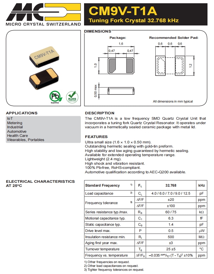 6G物聯網晶振,Micro微晶音叉晶體,CM9V-T1A-32.768kHz-12.5pF-20PPM-TA-QC,尺寸1610mm,頻率為32.768KHZ,MicroCrystal,瑞士進口晶振,進口貼片晶振,SMD晶振,石英晶振,兩腳貼片晶振,無源貼片晶振,水晶振動子,1610mm貼片晶振,石英貼片晶振,SMD晶體諧振器,石英晶體諧振器,32.768K音叉晶振,無鉛環保晶振,可穿戴設備晶振,醫療保健晶振,便攜式設備晶振,計時器晶振,32.768KHZ無源晶體,輕薄型晶振,工業應用晶振,汽車應用晶振,醫療保健專用晶振,高性能晶振,高精度晶振,低功耗晶振,低損耗晶振。