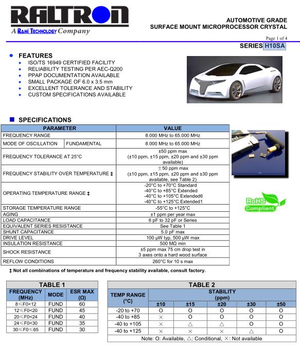Raltron晶振公司是全球較受歡迎的石英晶振,有源晶振,壓電石英晶體等頻率產品制造商之一.Raltron晶振,H10SA晶振,H10SA-24.000-18-3050-EXT1-TR晶振.