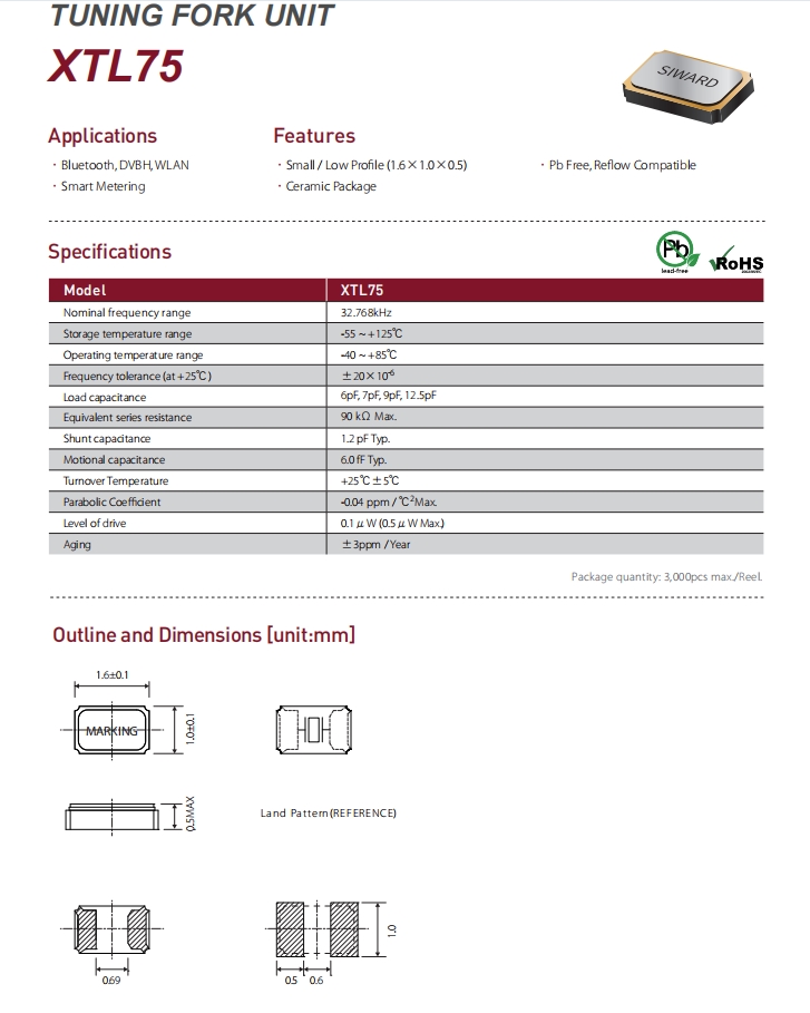 | XTL751-S999-420 | Siward | Siward | CRYSTAL 32.768 KHZ 20PPM CRYSTAL | XTL75 | 32.768 kHz | ±20ppm | 7pF |