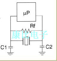 在并聯模式中,石英晶振電抗是電感性的,需要兩個外部電容器(C1)和(C2)來實現必要的振蕩相移.無論晶體處于基模還是泛音模式,都需要C1和C2.C1和C2的值由芯片制造商規定,從6pF到47pF不等.