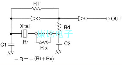 • 電路中的負電阻(-R)是通過上述方法獲得的值與晶體的諧振電阻R1之和.