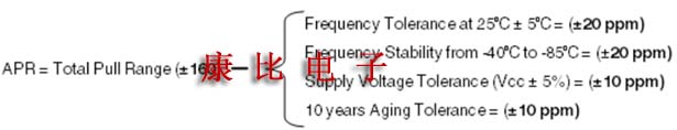 APR通過從VCXO的總穩(wěn)定性中減去總牽引范圍來計算.總牽引范圍是恒定電源電壓和溫度下,壓控振蕩器頻率隨控制電壓變化的最大變化.總穩(wěn)定性是指當控制電壓在制造公差,電源電壓,工作溫度和老化變化范圍內保持在標稱值時,VCXO頻率的變化.這種差異導致頻率變化,這是由于控制電壓獨立于所有其他條件和變化而得到保證的.