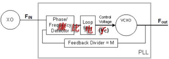 鎖相環(huán)通過將壓控振蕩器時鐘頻率和相位除以反饋分頻器(M)的值,并將其與相位/頻率檢測器中輸入時鐘頻率和相位(FIN)的相位和頻率進行比較,從而產生誤差信號.相位/頻率檢測器的輸出由環(huán)路濾波器進行低通濾波,以產生FOUT的控制電壓調整,從而閉合環(huán)路.鎖定時,鎖相環(huán)的輸出頻率(FOUT)正好是輸入頻率的M時代,并與輸入參考時鐘相位對齊.如果Fout必須等于Fin,則添加值為M的后分頻器或將M設置為1.