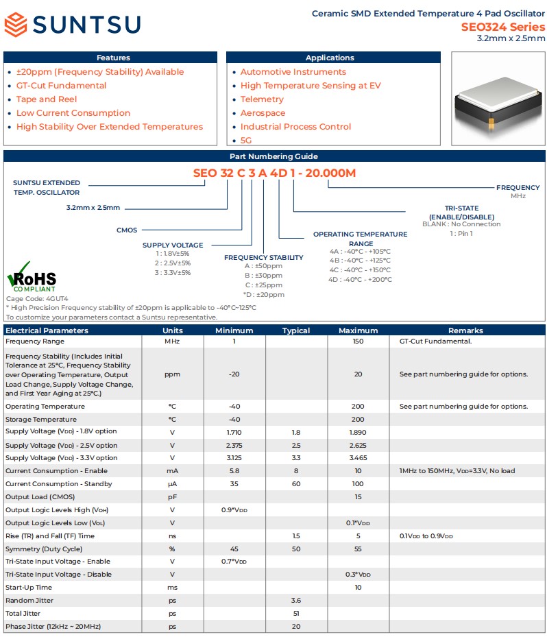Suntsu松圖晶振SEO324系列,封裝尺寸為3.2×2.5毫米陶瓷SMD擴展溫度4墊振蕩器,頻率范圍為1MHz至150MHz,四腳貼片晶振,有源晶振,石英晶體振蕩器。可用于高溫和極端環境下的應用,如航空電子、井下鉆井測量、發動機傳感器、遙測、5G、航空航天和工業過程控制。如下圖所示,在-40℃至約200℃的溫度范圍內,頻率穩定性為+/-50ppm。GT-cut耐高溫振蕩器SEO32C2D4C1-20.000M航空電子和6G應用晶振
