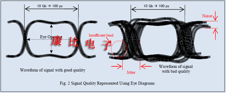 眼圖通常被用作評估通信系統中信號質量的方法.這些圖表使用示波器或類似的測量設備采集高速數字信號波形的多個樣本.然后,這些波形相互疊加,形成圖形表示."眼圖"這個名字來源于類似眼睛的分層波形的視覺外觀.例如,我們將看看10GbE何時被用作傳輸信道通信協議.在該系統中,轉發10Gbps信號所需的時間(長度)相當于每比特信號100psec.為了評估信號質量,信號每100psec重復一次,以獲得眼圖.例如,如果我們假設參考信號是純的,并且傳輸通道專用集成電路設計良好,那么我們將觀察到如圖2左側所示的對齊良好的波形.相反,在信號丟失的情況下,例如由具有顯著石英晶體振蕩器噪聲或抖動的參考信號或設計不良的專用集成電路引起的傳輸信道頻帶不足,信號波形是不穩定的,波形的分層導致如圖2右側所示的"閉眼"類型.將信號數據識別為0或1在很大程度上依賴于眼睛睜開的水平和垂直方向