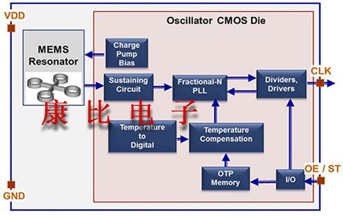 本文康比電子將要討論的最后一種諧振器技術是基于微機電系統(tǒng)(MEMS)的諧振器.MEMS采用標準半導體制造工藝來生產微型機械元件.這些器件的尺寸從微米到毫米不等.類似于高頻音叉的諧振器設計用于在靜電激勵下振動.這些諧振器的芯片結構與可編程振蕩器/控制器集成電路結合在一起(圖1).