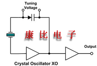 某些應用需要調整振蕩器的頻率,這一調整可通過數(shù)字方式或模擬控制來完成.模擬控制使用壓控晶體振蕩器(VCXO)來完成.圖5顯示了如何通過向與諧振器串聯(lián)的變容二極管施加電壓,并通過改變負載電容來改變其頻率的方式來調整振蕩器,這是VCXO的基本原理.